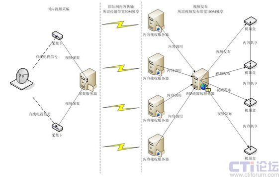 帶寬接入:用于國內(nèi)到國際的出口帶寬,使用大小為50M獨享,以滿足在有效時間內(nèi)可完成所有內(nèi)容的傳輸;用于國外用戶響應(yīng)發(fā)布的P2P流媒體服務(wù)器出口帶寬為100M,可滿足至少2000并發(fā)用戶的P2P直播點播觀看需求。