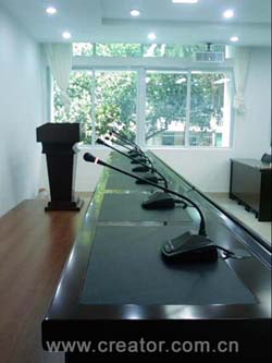所以在本會(huì)議室配置了1臺標(biāo)準(zhǔn)的會(huì)議討論型控制主機(jī)臺CR-M4101,1臺座式的主席機(jī)CR-M4102B,9臺座式的會(huì)議代表機(jī)CR-M4104B,另外還有連接電纜等。主席機(jī)具優(yōu)先控制權(quán),設(shè)置主席位置,并且可以移動(dòng),代表機(jī)分別設(shè)置其余數(shù)個(gè)話筒點(diǎn)。采用手拉手方式,一條總線即可連接所有會(huì)議討論設(shè)備,布線簡單快捷。通過專業(yè)的音頻輸出口和音響擴(kuò)聲系統(tǒng)結(jié)合,清晰、明亮的將發(fā)言人的聲音重放出來。