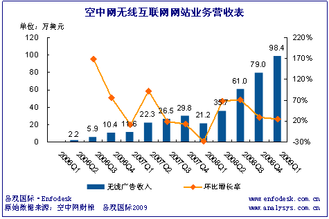 空中網(wǎng)2009年第1季度總營(yíng)收為2960萬(wàn)美元,其中總無(wú)線增值服務(wù)(不包括手機(jī)游戲)營(yíng)收為2366萬(wàn)美元,同比增長(zhǎng)19%,比上一季度增長(zhǎng)2%,占總營(yíng)收的79.96%,而手機(jī)游戲和無(wú)線廣告分別占比16.71%、3.33%。易觀國(guó)際(Analysys International)認(rèn)為,對(duì)于空中網(wǎng)2009年第1季度市場(chǎng)表現(xiàn)應(yīng)關(guān)注以下幾點(diǎn):
