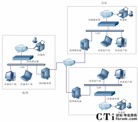 圖1-2 三匯傳真服務器典型組網圖(多服務器)