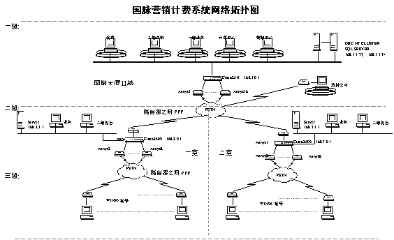 一級為計費中心,位于國脈大廈內(nèi),作為整個系統(tǒng)的運行中心和數(shù)據(jù)中心,也是整個系統(tǒng)的樞紐。二級主要位于二個營業(yè)室,是整個系統(tǒng)的分中心。三級為各營業(yè)所和代銷點,分散在全市各處是整個系統(tǒng)的數(shù)據(jù)基礎(chǔ)。