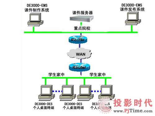 將全省各地市級院校與區(qū)縣級院;蛩搅⒃盒_B接起來,組成一個相對簡單卻有效的遠(yuǎn)程教育網(wǎng)絡(luò),使教學(xué)水平相對落后地區(qū)的學(xué)生能方便地享用遠(yuǎn)程教育網(wǎng)所提供的優(yōu)秀教育資源,通過實時授課、課件學(xué)習(xí)等方式極大的方便學(xué)生學(xué)習(xí),提高成績?紤]到區(qū)縣級院校的教學(xué)水平和經(jīng)費問題,可以在各地市級院校配置CNKaran的DE3000-UES遠(yuǎn)程教育產(chǎn)品。而在區(qū)縣級院校只配置一臺PC加攝象頭,來實現(xiàn)遠(yuǎn)程授課或遠(yuǎn)程教學(xué)培訓(xùn)。