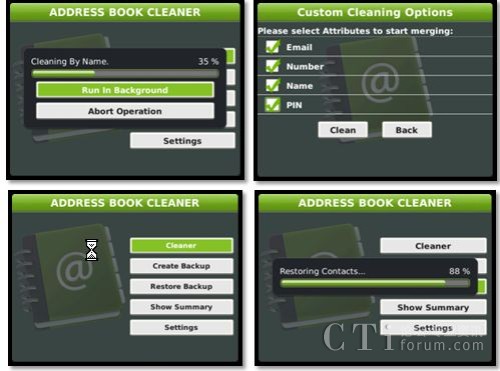 同事、同學、朋友、家人、客戶、合作伙伴…你的黑莓手機中存了多少聯(lián)系人了?其中又是否有重復(fù)存儲呢?一款名為Address Book Cleaner應(yīng)用,可以幫助你整理和合并黑莓手機中的重復(fù)聯(lián)系人信息。該應(yīng)用可設(shè)置按照重復(fù)姓名、號碼、電子郵件地址、PIN碼等進行查重、合并和刪除,并可在整理結(jié)束后給出整理報告。同時,Address Book Cleaner還可以隨時隨地將通訊薄中的聯(lián)系人信息進行備份和恢復(fù),可讓用戶在無法與PC的BlackBerry Desktop Manager連接的時候,也可以輕松進行聯(lián)系人的備份和恢復(fù)操作。