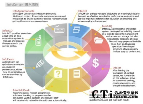 由于今日的客服中心已是多媒體的客服中心,不再只有單純的電話進(jìn)線,客戶尋求服務(wù)的管道更多樣化,InfoCenter Total Solution可以完全整合應(yīng)用程序、數(shù)據(jù)倉(cāng)儲(chǔ)系統(tǒng)、多媒體溝通互動(dòng)管道,藉由不同的系統(tǒng)達(dá)到分析與處理客戶需求,并且達(dá)到一致性的工作流程管理,提供更高質(zhì)量的服務(wù)。