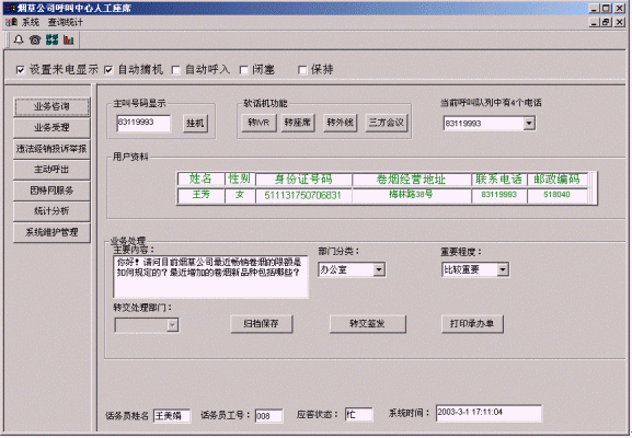 客戶打入電話后,當(dāng)系統(tǒng)的自動(dòng)語音應(yīng)答子系統(tǒng)無法解決客戶問題時(shí),客戶可選擇人工服務(wù),由企業(yè)客戶服務(wù)代表直接接聽客戶電話,處理并解決客戶問題。此時(shí)客戶同座席話務(wù)人員直接溝通,并同時(shí)記錄下該客戶的聯(lián)系方式,將相關(guān)數(shù)據(jù)添加入系統(tǒng)數(shù)據(jù)庫;也可以在數(shù)據(jù)庫的支持下回答接受查詢卷煙/價(jià)格/限額/新品種、卷煙經(jīng)營規(guī)范制度/卷煙專賣政策法規(guī)咨詢、通報(bào)最近暢銷卷煙的限額情況/通報(bào)最近增加的新品種/煙草公司召集的活動(dòng)通知、投訴和舉報(bào)違法經(jīng)銷行為、卷煙預(yù)訂、電話訪銷、滿意度調(diào)查等。