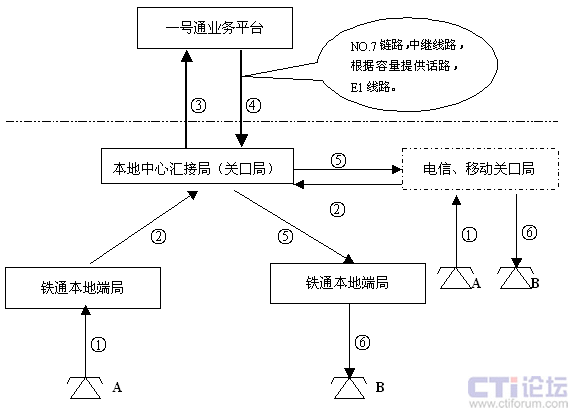 呼叫可以來自鐵通各匯接局(關口局)以及從該匯接局(關口局)接入的移動、聯(lián)通、電信呼叫,轉移可以是鐵通各匯接局(關口局)以及從該匯接局(關口局)出去的對移動、聯(lián)通、電信呼叫。