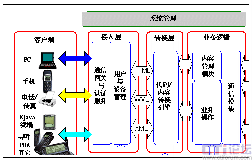 系統(tǒng)支持多種接入設備,包括廣泛使用的Web瀏覽器、支持WAP或HDML的移動電話、支持Kjava的移動終端、基于PalmOS或WinCE的PDA(個人數字助理)、傳統(tǒng)的移動電話和尋呼等,并可以方便對于未來的接入設備進行定制。