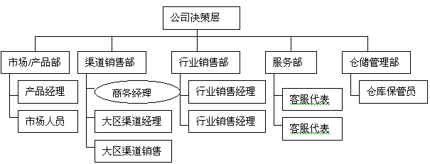 除分銷(xiāo)渠道管理之外,紫光網(wǎng)聯(lián)的前端管理組織機(jī)構(gòu)還包括市場(chǎng)/產(chǎn)品部、行業(yè)銷(xiāo)售部、服務(wù)部和倉(cāng)儲(chǔ)管理部門(mén)。示意圖如下: