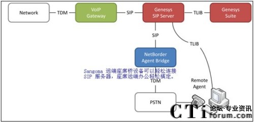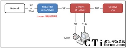 呼叫中心的蓬勃發(fā)展帶動(dòng)了呼叫中心廠家投入巨資開(kāi)發(fā)呼叫中心最核心的功能,例如拓展呼叫中心的接入,座席的管理,洗號(hào)系統(tǒng)。除了支持Asterisk,F(xiàn)reeswitch平臺(tái)的高并發(fā)A116 16E1做為高并發(fā)呼叫中心以外,Sangoma早在2004 年就開(kāi)始和世界知名呼叫中心廠家Genesys 合作,開(kāi)發(fā)了呼叫中心的洗號(hào)系統(tǒng),遠(yuǎn)端座席管理,PSTN 接入等強(qiáng)大的工具,從而提高了大型呼叫中心的接通率和座席管理的靈活性。Sangoma 通過(guò)genesys 兼容性測(cè)試,完全兼容Genesys 呼叫中心平臺(tái)。NetBorder 系統(tǒng)架構(gòu)如下: