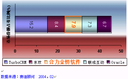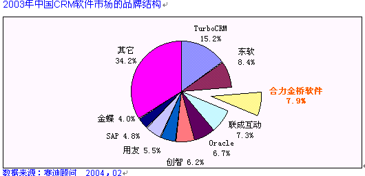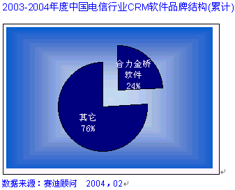 HOLLYCRM(合力金橋軟件)公司作為實力卓越的CRM主流廠商, 致力于提供最專業(yè)化的應用軟件和服務,提供以客戶為核心的信息化解決方案,服務領域跨越電信運營商、金融業(yè)、制造業(yè)等行業(yè)。在電信行業(yè)的CRM市場中,合力金橋軟件處于穩(wěn)固領先位置, 其推出的客戶關系管理解決方案,覆蓋協(xié)作型、運營型和分析型的全部范疇。在CRM產(chǎn)業(yè)在2003年的中國發(fā)展態(tài)勢整體放緩的大環(huán)境下, HOLLYCRM卻一枝獨秀, 在不到一年的時間里簽下中國網(wǎng)通總部、天津網(wǎng)通、山西網(wǎng)通、內蒙聯(lián)通等大型CRM項目,積累了豐富的CRM項目實施經(jīng)驗。在累計的電信行業(yè)CRM軟件市場中,合力金橋軟件一家占有份額就達到24%, 合力金橋軟件此次在CCID年度研究報告中倍受矚目可謂眾望所歸, 充分說明了其CRM產(chǎn)品在高端行業(yè)的領軍地位, 如圖: