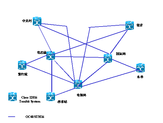 北京電信公眾IP網(wǎng)的骨干節(jié)點構成的骨干網(wǎng)拓撲情況如圖:
