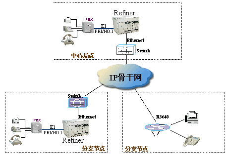 對(duì)于大多數(shù)的企業(yè)用戶,都擁有自己的用戶交換機(jī)PBX。在進(jìn)行IP電話網(wǎng)的建設(shè)中,這些PBX將被保留,繼續(xù)承擔(dān)起用戶接入的功能。而這些PBX之間的中繼連接都將通過(guò)IP骨干網(wǎng)來(lái)完成。這樣,既可以節(jié)約價(jià)格不菲的長(zhǎng)途中繼租用費(fèi),也避免了大規(guī)模的改造所帶來(lái)的浪費(fèi)。