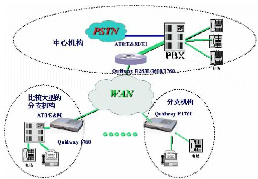 。。如圖是一個(gè)典型的企業(yè)網(wǎng)IP電話組網(wǎng)方案,在總部采用Quidway®R3640E/3680E路由器作為中心語音網(wǎng)關(guān)設(shè)備,在E1線路上實(shí)現(xiàn)VoIP功能;如果機(jī)構(gòu)規(guī)模不是很大,也可以采用AT0/E&M連接PBX;在各分支機(jī)構(gòu)及網(wǎng)點(diǎn),則可采用Quidway® R1760連接PBX或普通電話,實(shí)現(xiàn)語音信號在傳統(tǒng)電路交換網(wǎng)絡(luò)和IP網(wǎng)絡(luò)之間的轉(zhuǎn)換,為企業(yè)提供高質(zhì)量、低費(fèi)用的語音互聯(lián)。