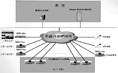 在公司總部安裝一套寬帶視訊交換平臺(tái)ViewPoint 8620及管理系統(tǒng),在公司總部建設(shè)一個(gè)大型視訊會(huì)議室作為主會(huì)場(chǎng),視訊終端采用ViewPoint 8030mBox。北京另外兩個(gè)小會(huì)議室配置普通視訊終端ViewPoint 8020plus,外地30個(gè)辦事處會(huì)議室各配置一臺(tái)ViewPoint 8020plus視訊終端。2套ViewPoint OpenEye視訊終端安裝于領(lǐng)導(dǎo)桌面,可以用于接入會(huì)議、召集會(huì)議,或者內(nèi)部IP話等。本系統(tǒng)總共包括一臺(tái)ViewPoint8620視訊交換平臺(tái),一臺(tái)ViewPoint 8030mBox視訊終端和32臺(tái)ViewPoint 8020plus視訊終端,兩套領(lǐng)導(dǎo)用桌面終端ViewPointOpenEye。