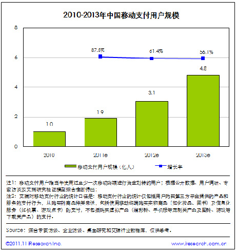 根據(jù)艾瑞咨詢統(tǒng)計數(shù)據(jù),2011年中國移動支付用戶規(guī)模將達(dá)到1.9億。艾瑞預(yù)計,2013年中國移動支付用戶規(guī)模將達(dá)到4.8億。移動網(wǎng)上支付用戶規(guī)模的增長帶動了整個行業(yè)用戶規(guī)模的爆發(fā),另外手機短信支付也在用戶群體中得到了進一步的普及。