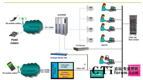 那么如何快速的實(shí)現(xiàn)3G IVVR的這些功能呢?林克海德愿意幫助您一起完成這項(xiàng)工作,基于Dialogic產(chǎn)品的全力支持,您可以實(shí)現(xiàn)web頁面到3G手機(jī)的視頻轉(zhuǎn)換,也可以與舊有的傳統(tǒng)呼叫中心(2G)互聯(lián)互通,快速建立一整套系統(tǒng)。您可以通過3G手機(jī)打到Dialogic視頻網(wǎng)關(guān),再通過3G Bridge與web server連接,3G Bridge起的主要作用就是把web上的HTTP轉(zhuǎn)換成RTP\RTSP文件,這樣就完成了web與3G手機(jī)的互動(dòng),同樣的,如果您想和傳統(tǒng)的呼叫中心進(jìn)行連接,只需要用Dialogic的媒體服務(wù)器接入舊有的ACD\PBX里,就可以把3G與2G 的平臺(tái)連接到一起,實(shí)現(xiàn)互聯(lián)互通。