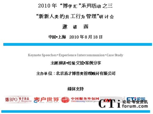21世紀(jì)什么是貴?人才最貴!人才是企業(yè)持續(xù)發(fā)展的唯一生命之源。易才博普奧公司(CTG BPO)作為專業(yè)的人力資源外包專家、服務(wù)外包產(chǎn)業(yè)專業(yè)人才租賃供應(yīng)商,近年來在業(yè)界積累了大量優(yōu)秀的一線人才租賃經(jīng)驗并得到廣泛的業(yè)界好評!2010年伊始,易才博普奧推出了“博學(xué)匯”系列客戶交流會活動,旨在搭建一個與行業(yè)精英、業(yè)內(nèi)專家互動交流的平臺,學(xué)習(xí)、體驗和分享多元文化,促進(jìn)和推動彼此之間的交流與合作。