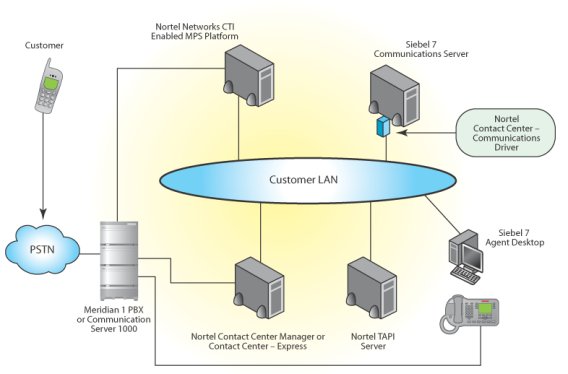 客戶、PSTN、北電網(wǎng)絡(luò)支持CTI的MPS平臺(tái)、Siebel7通信服務(wù)器、北電聯(lián)絡(luò)中心通信驅(qū)動(dòng)器、客戶LAN、Meridian 1 PBXX或通信服務(wù)器1000、北電聯(lián)絡(luò)中心管理器或快速聯(lián)絡(luò)中心、北電TAPI服務(wù)器、Siebel7座席桌面系統(tǒng)