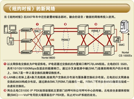 VoIP架構(gòu)是基于北電的通信服務(wù)器CS 1000平臺(tái),該平臺(tái)是一種基于服務(wù)器的IP PBX。CS 1000是基于北電的Meridian PBX特性集合,其主機(jī)運(yùn)行在一臺(tái)來(lái)自WindRiver系統(tǒng)公司的VxWorks實(shí)時(shí)操作系統(tǒng)的IP服務(wù)器上。一對(duì)冗余的CS1000將為新聞、廣告、發(fā)行和其他部門中大約3600 部IP電話以及部署在《紐約時(shí)報(bào)》的分類/顯示廣告呼叫中心的300部IP軟電話提供服務(wù)。CS 1000提供對(duì)34臺(tái)以上的媒體網(wǎng)關(guān)和18臺(tái)信令服務(wù)器(部署在網(wǎng)絡(luò)中為內(nèi)網(wǎng)連接的不同部門提供VoIP呼叫建立和信令的分布式專用設(shè)備)的集中管理。