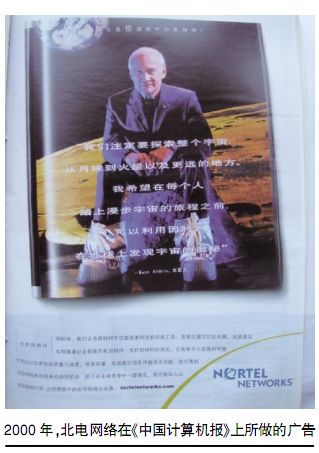 2000年,北電網絡在《中國計算機報》上所做的廣告 1995年,北電開始從電話制造公司向網絡設計、構建及集成公司的演變。起初,業(yè)界分析人士對此予以奚落,認為這是一家電信商膚淺的裝飾門面之舉。一位分析師曾尖銳地稱之為“一群四十多歲的人穿著跳迪斯科的衣服”。