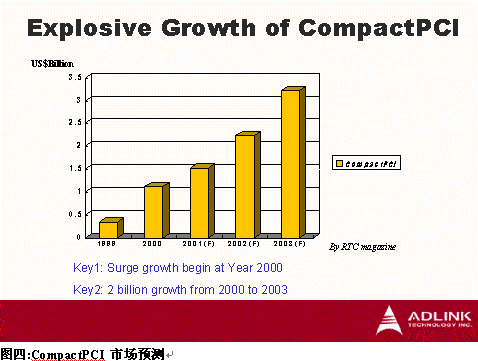 Magazine 估計,CompactPCI市場將由1999年的美金$350 Million成長到2003年的美金$3200 Million,年復合成長率高達45.6%,其中又以2002年至2003年最大幅成長。CompactPCI為工業(yè)計算機產(chǎn)業(yè)開拓了一個以往傳統(tǒng)工業(yè)計算機無法應用的新市場,而CompactPCI需針對電信等級應用提供高可靠度及達到嚴苛高品質(zhì)要求,卻又為傳統(tǒng)工業(yè)計算機廠商豎立高進入障礙,因此,目前能提供電信級CompactPCI寬頻通訊平臺幾為國外廠商,如Motorola、Ziatech、Force