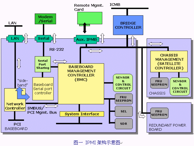 圖一為整個IPMI架構的示意圖。位于整個架構中心的部份即為我們所謂的Baseboard Management Controller (BMC)。它通過各別的界面來管理整個系統(tǒng),如系統(tǒng)狀態(tài)偵測及事件過濾、電源管理、記錄事件發(fā)生時間及系統(tǒng)回復控制,并且透過網(wǎng)絡或串行端口來告知管理人員,另外,它提供了IPMB的總線來和外部的管理控制器互相溝通。