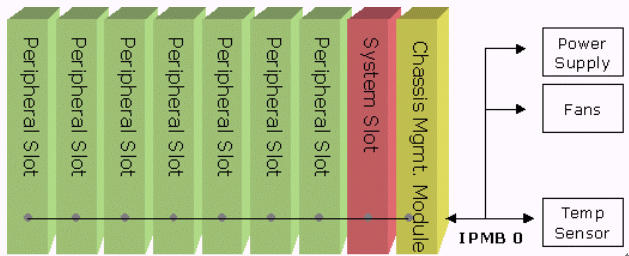 在單板上設計了支持IPMI的控制組件,對于每一片的CompactPCI單板,其系統(tǒng)上都有一個BMC的組件存在。但若整合到一個機箱內,這些BMC的角色則必須要更改成一個PMC