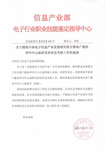 中國(guó)電子信息產(chǎn)業(yè)發(fā)展研究院職業(yè)技能培訓(xùn)部是中國(guó)電子信息產(chǎn)業(yè)發(fā)展研究院旗下專業(yè)從事IT職業(yè)技能培訓(xùn)的機(jī)構(gòu)。呼叫中心職業(yè)技能培訓(xùn)工作是培訓(xùn)中心常年開(kāi)展的主要培訓(xùn)項(xiàng)目。培訓(xùn)中心受信息產(chǎn)業(yè)部委托,負(fù)責(zé)全國(guó)范圍內(nèi)"呼叫中心客戶服務(wù)座席員"的授權(quán)培訓(xùn)及考核工作。既是呼叫中心行業(yè)基礎(chǔ)操作人員培訓(xùn)及考核的權(quán)威機(jī)構(gòu),又是配合行業(yè)管理、全面支撐和提升整個(gè)呼叫中心產(chǎn)業(yè)的服務(wù)機(jī)構(gòu)。