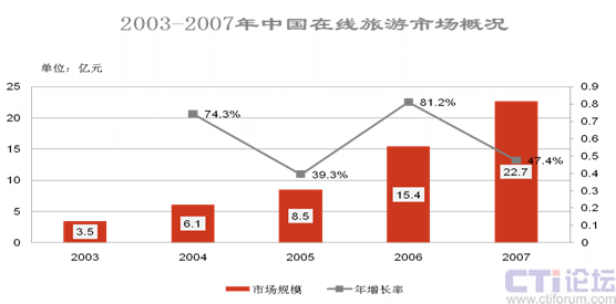 根據(jù)Iresearch的數(shù)據(jù),2007年,中國在線旅游市場(chǎng)規(guī)模達(dá)到22.7億元,比06年同比增長(zhǎng)47.5%;其中攜程以56.3%的市場(chǎng)份額繼續(xù)領(lǐng)跑,比06年的54.2%增長(zhǎng)了2個(gè)百分點(diǎn)。與此相對(duì)比的是,美國三強(qiáng)旅游網(wǎng)站之一的Travelocity,在06年第一季度的全球營收就達(dá)到了24億美金。具體情況如下圖所示: