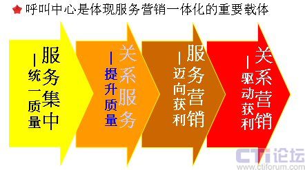 呼叫中心是體現(xiàn)服務(wù)營銷一體化的重要載體。我在前面已經(jīng)說了,服務(wù)和營銷一個是被動一個是主動,一個inbound一個outbound,呼叫中心可以非常完整地將兩者融合到一起,它是一個非常重要的服務(wù)營銷的載體。我們從呼叫中心整個營銷策略的進程當(dāng)中,可以看到非常明顯的四個階段: