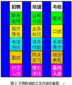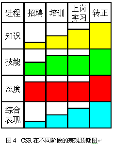即使經(jīng)過規(guī)范的上崗培訓(xùn)與考核,新員工通常也只達(dá)到老員工70%左右的表現(xiàn)。因此制定明確的實(shí)習(xí)期,在實(shí)習(xí)期間加強(qiáng)指導(dǎo)和培養(yǎng)是非常重要的。通常經(jīng)過3個月的實(shí)習(xí),新員工已經(jīng)可以達(dá)到一個標(biāo)準(zhǔn),這時便可以轉(zhuǎn)正了。圖3和圖4表現(xiàn)了不同階段對CSR的不同預(yù)期,以及不同階段的主要工作。