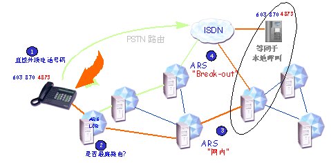 當(dāng)網(wǎng)絡(luò)內(nèi)用戶(hù)呼叫外線(xiàn)電話(huà)時(shí),ARS/LCR分析該地號(hào)碼信息。每個(gè)阿爾卡特OmniPCX 系列在任何時(shí)候都能知道專(zhuān)網(wǎng)的準(zhǔn)確拓?fù)浣Y(jié)構(gòu),并能并實(shí)時(shí)獲取不同路由及相應(yīng)話(huà)務(wù)負(fù)荷的實(shí)際情況(信息通過(guò)D信道信令傳遞)。因此OmniPCX 系列能夠通過(guò)專(zhuān)網(wǎng)架構(gòu)透明地選擇最廉路由,并在合適的網(wǎng)絡(luò)節(jié)點(diǎn)發(fā)起一個(gè)呼叫費(fèi)用最低的外線(xiàn)呼叫(出局)。