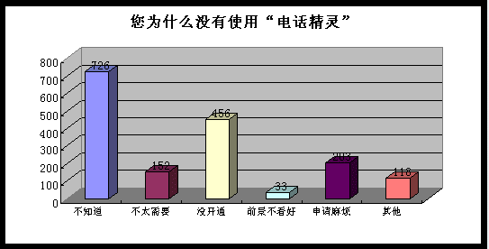 尚有相當(dāng)多地區(qū)沒有開通此類服務(wù),用戶感到遺憾。在“您為什么沒有使用‘電話精靈’?”的統(tǒng)計(jì)結(jié)果中“當(dāng)?shù)貨]有開通”是一項(xiàng)主要原因,有不少用戶都留言希望能將電話精靈業(yè)務(wù)在更廣泛地區(qū)應(yīng)用。曾經(jīng)使用過“電話精靈”,但后期由于運(yùn)營商停止了此項(xiàng)業(yè)務(wù)而不再使用的用戶也深感遺憾。
