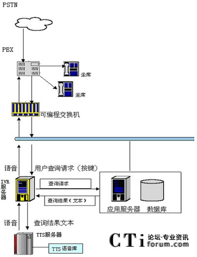 用戶撥打統(tǒng)一特服號(hào)碼進(jìn)入客戶服務(wù)系統(tǒng),經(jīng)過(guò)自動(dòng)語(yǔ)音系統(tǒng)提示,選擇公共信息查詢項(xiàng)目。用戶可以通過(guò)電話提交他的查詢請(qǐng)求(比如使用按鍵方式),IVR服務(wù)器收到請(qǐng)求后會(huì)向其他應(yīng)用服務(wù)器提交此查詢請(qǐng)求,當(dāng)IVR得到查詢結(jié)果后,他會(huì)將文本形式的查詢結(jié)果交給jTTS服務(wù)器,jTTS服務(wù)器會(huì)返回查詢結(jié)果的語(yǔ)音形式,最終語(yǔ)音會(huì)在坐席上播放,用戶就可以聽(tīng)到他剛才所要查詢的信息。