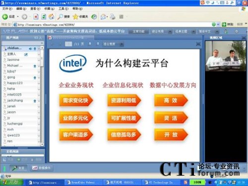 2011年3月25日,intel攜手V2威速租用型視頻會議,針對構建云計算平臺,展開了一場主題為“找到云的“高低”——開放架構支撐高靈活、低成本的云平臺”別開生面的線上研討會。在此之前,V2威速租用型視頻會議曾多次攜手intel、EMC、APC、SAP等成功開展線上研討會。活動的成功舉辦為intel提供了一個良好的與客戶交流溝通的平臺。