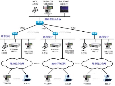 在株洲、邵陽和永州市行采用級聯(lián)的方式來實現(xiàn)。具體實現(xiàn)方式為: 寶利通新型視頻會議終端VSX 7000E則和地市行的寶利通多點控制單元(MCU)MGC-25通訊,并且MGC-25負責(zé)其縣支行終端的接入,同時用MGC-50和MGC-25的端口級聯(lián),采用這種連接方式就可以實現(xiàn)從省行-地市行-縣支行的三級網(wǎng)視頻會議的召開。