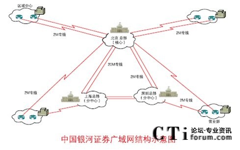 銀河證券采用二級網(wǎng)絡結(jié)構,其中一級采用三中心的冗余結(jié)構;二級為各營業(yè)部。營業(yè)部線路上采用雙專線的冗余線路方式,其中兩條線路分別屬于兩家不同的電信運營商。營業(yè)設備上采用雙設備,保證了營業(yè)部在設備上的冗余,避免硬件設備單點故障,同時實現(xiàn)了業(yè)務網(wǎng)與辦公網(wǎng)的物理分離。