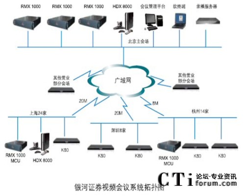 銀河證券視頻會議系統(tǒng)采用寶利通視頻會議產(chǎn)品,在銀河證券北京總部中心機房配備寶利通新一代實時媒體會議平臺 RMX 1000 MCU和高清錄播服務器;在上海和杭州也分別配置了RMX