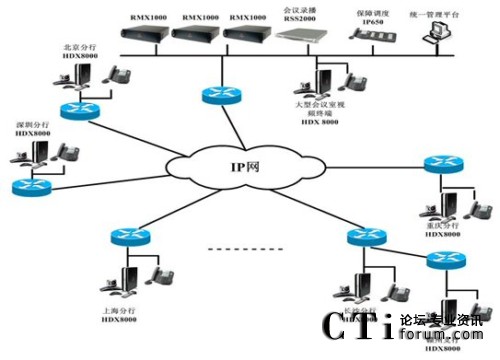 RMX1000作為多媒體多點處理單元,70臺HDX8006和HDX8002分布在全國各個分行作為視頻會議的接入,RSS2000服務器提供HD的會議錄制;65臺IP電話作為實時會議備份系統(tǒng);整個系統(tǒng)提供720P/60幀或1080P/30幀的會議畫面質量,音頻達到22KHz寬帶音質,劇院級音質享受,具備新一代高清雙流P