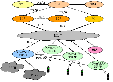 中興PCS智能網(wǎng)可根據(jù)用戶需要采用多種靈活的組網(wǎng)方案,既可全省或多地區(qū)集中建設一套平臺,充分節(jié)約投資和快速進行業(yè)務提供,又可按地市單獨建設,充分保證業(yè)務的靈活性。系統(tǒng)支持與其他PCS網(wǎng)絡的良好互通,可同時為其它系統(tǒng)提供PCS智能業(yè)務。中興PCS智能網(wǎng)基于No.7信令與交換網(wǎng)絡連接,不占用話路資源,采用嵌入式組網(wǎng),智能業(yè)務采用簽約信息觸發(fā),SSP(Service Switch Point)和SCP(Service Control Point)之間采用No.7信令進行通信,在這種組網(wǎng)方式下,不存在話路迂回,有效節(jié)約運營商寶貴的網(wǎng)絡資源,并可以根據(jù)簽約信息靈活開展多種智能業(yè)務,智能網(wǎng)信令也能很好地支持用戶的移動性,給用戶提供更靈活、方便和個性化的服務。