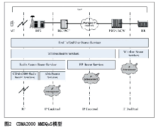IMS是端到端的全I(xiàn)P架構(gòu),提供端到端的VoIP業(yè)務(wù)取代傳統(tǒng)的移動(dòng)電話業(yè)務(wù)。對(duì)于VoIP電話,影響其發(fā)展的首要因素是需要提供完善的QoS機(jī)制來(lái)保證其話音質(zhì)量不差于傳統(tǒng)移動(dòng)電話的話音質(zhì)量。圖2顯示了CDMA2000
