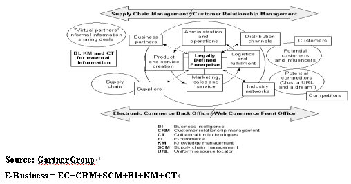 在 GartnerGroup 的一個(gè)名為“如何制定一個(gè)可操作的、有效的電子商務(wù)戰(zhàn)略”的報(bào)告中描述了電子商務(wù)(E-Business)的所有基本要素,他們是商業(yè)智能(BI),客戶關(guān)系管理(CRM),供應(yīng)鏈管理(SCM),知識管理(KM), 協(xié)同技術(shù)(CT) 和E-Commerce。這些要素將成為新的一輪電子商務(wù)浪潮的特征。一些公司如 Dell, IBM,已經(jīng)成為這一輪變革中成功的代表。