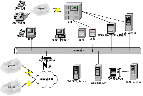 呼叫中心的功能主要有兩方面,一是與用戶進行交互,另外與金融主機房進行數(shù)據(jù)交互。呼叫中心系統(tǒng)由兩部分組成:聲訊平臺(CALL CENTER)和業(yè)務(wù)數(shù)據(jù)計算機網(wǎng)絡(luò)平臺。聲訊平臺由話務(wù)接入設(shè)備(ACD)、IVR系統(tǒng)和CTI服務(wù)器組成,主要負責(zé)語音資源的管理、呼入話務(wù)的排隊、自動業(yè)務(wù)以及人工座席的管理等;業(yè)務(wù)數(shù)據(jù)計算機網(wǎng)絡(luò)平臺是對業(yè)務(wù)數(shù)據(jù)的收集、使用、管理、分析等。平臺間通過CTI技術(shù)實現(xiàn)數(shù)字數(shù)據(jù)和語音數(shù)據(jù)的相互轉(zhuǎn)換和同步轉(zhuǎn)移。系統(tǒng)結(jié)構(gòu)如下。