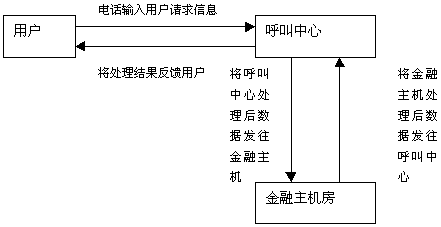 用戶通過撥打電話185連接到185客戶服務(wù)中 心,然后根據(jù)客戶服務(wù)中心的提示信息利用電話按鍵或語音輸入用戶的請求信息。用戶的請求信息傳送到呼叫中心后,呼叫中心會根據(jù)用戶的請求信息內(nèi)容進行處理,如查詢儲蓄法規(guī)等,然后將處理結(jié)果反饋給用戶,如果牽涉到用戶的帳戶數(shù)據(jù),則呼叫中心將用戶的請求首先進行處理,然后將處理后的信息發(fā)送給金融主機房,由金融主機根據(jù)呼叫中心傳來的數(shù)據(jù)進行帳務(wù)處理,然后將處理結(jié)果返回給呼叫中心,呼叫中心再對金融主機房返回的數(shù)據(jù)進行處理成客戶能夠聽到的語音信息,將處理結(jié)果傳給用戶。上述流程是一個單個處理流程,實際上跟用戶進行交互時,一項業(yè)務(wù)會有多個往返的處理流程。