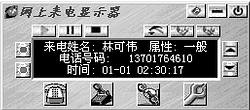軟件簡介:主要解決用戶在撥號上網(wǎng)(不包括上網(wǎng)專線電話和部分虛擬小區(qū)用戶)的同時(shí)又不想錯過來電的矛盾。在你上網(wǎng)時(shí)一旦有人打電話給你,您就可以通過Netcaller得知來電信息,還可給對方播放諸如“請稍候打過來,我馬上斷線”、“您的電話號碼我已知道,稍候我會打過來”、“請撥打另一個(gè)號碼xxx”,“請留言”等等語音提示。