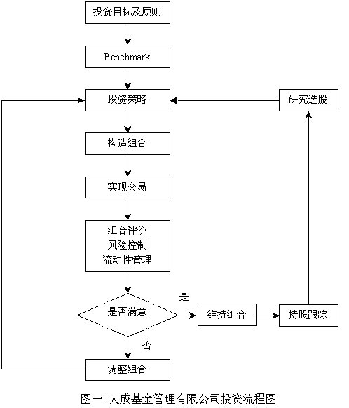 程序化是公司持續(xù)、健康發(fā)展的首要基礎(chǔ),也是公司擴(kuò)大規(guī)模、規(guī)范管理的必要條件。大成選擇了清晰而明確的投資流程(見(jiàn)圖一)。