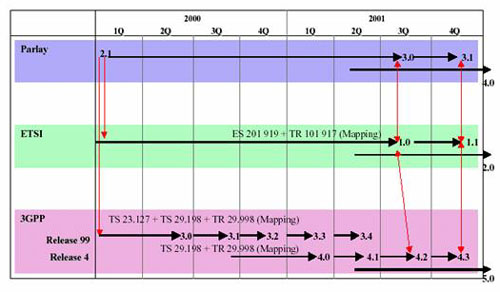 1998年4月,Parlay工作組成立,成員主要有英國電信、Ulticom 、微軟 、北電 、西門子組成,并于1998年12月出版提出最初的版本。Parlay工作組的目標(biāo)是通過規(guī)范開放應(yīng)用程序接口,聯(lián)合IT應(yīng)用和通信應(yīng)用的開發(fā)能力,促使通信應(yīng)用數(shù)量的飛速發(fā)展。1999年5月,隨著AT&T、Cegetel、Cicso、Ericsson、IBM和Lucent等6個新成員的加入,成員總數(shù)增加至共11名。2000年1月API2.0出版,僅6個月后,API2.1出版。在2001年2月,Parlay工作組成員增加至37個,并推出Parlay3.0。Parlay