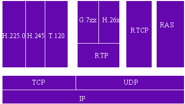 H.323是一個框架性協(xié)議,它是由系列協(xié)議組成的,圖5列出了H.323棧的基本內(nèi)容。
