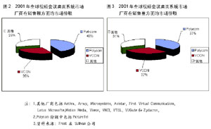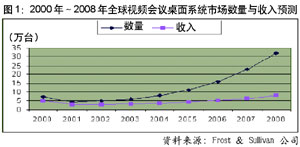 2002年年初,在IDC預(yù)測的本年度IT業(yè)界熱點技術(shù)中,視頻會議技術(shù)位居前列。而根據(jù)通信專業(yè)領(lǐng)域著名獨立研究機構(gòu)Wainhouse 的一份調(diào)查報告,2001年全球視頻通信領(lǐng)域僅設(shè)備市場,容量就達(dá)到近6億美元,占整個視頻會議市場52%的份額。Wainhouse還指出,2002年是視頻會議領(lǐng)域發(fā)展極為迅猛的一年,估計到2006年,整個視頻會議市場的市場容量將達(dá)到29億美元,比2001年增長20.4%。