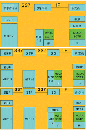 從圖中可以看出,軟交換和信令網(wǎng)關(guān)功能使用M3UA協(xié)議,軟交換只須具備MTP3以上層次的窄帶協(xié)議。信令網(wǎng)關(guān)功能則必須實現(xiàn)MTP1、2、3層。信令網(wǎng)關(guān)在M3UA方式下即可充當信令代理(信令網(wǎng)關(guān)和軟交換共享信令點碼),也可以用信令轉(zhuǎn)接點(STP)方式轉(zhuǎn)接信令(信令網(wǎng)關(guān)擁有自己獨立的信令點碼)。